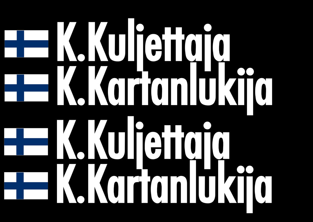 Historic tyyliset ralliauton nimitarrat Suomen lipuilla lokasuojaan, kuvan mukaisella tekstausfontilla tehtynä. Pyritään valmistamaan FIA/AKK sääntöjen mukaisesti 10x40cm kokoon, pitkä nimi saattaa mennä yli tämän.