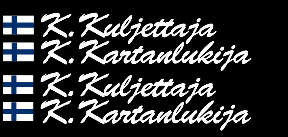 Historic tyyliset ralliauton nimitarrat Suomen lipuilla lokasuojaan, kuvan mukaisella fontilla tehtynä. Pyritään valmistamaan FIA/AKK sääntöjen mukaisesti 10x40cm kokoon, pitkä nimi saattaa mennä yli tämän.