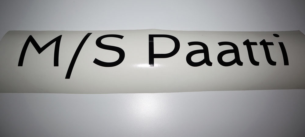 Veneen nimitarra kuvanmukaisella tekstausfontilla. Valmistetaan lähtökohtaisesti niin, että on noin 50cm mittainen. Eli mitä enemmän tekstiä, sitä matalampi tarrasta tulee. Kuvan mukainen noin 8cm kirjainkorkeudella (eli isot kirjaimet ovat tämän korkuisia), lisäkirjaimet tekisivät matalammaksi. Jos haluat pienemmän, laita lisätietoja kohtaan haluttu koko.