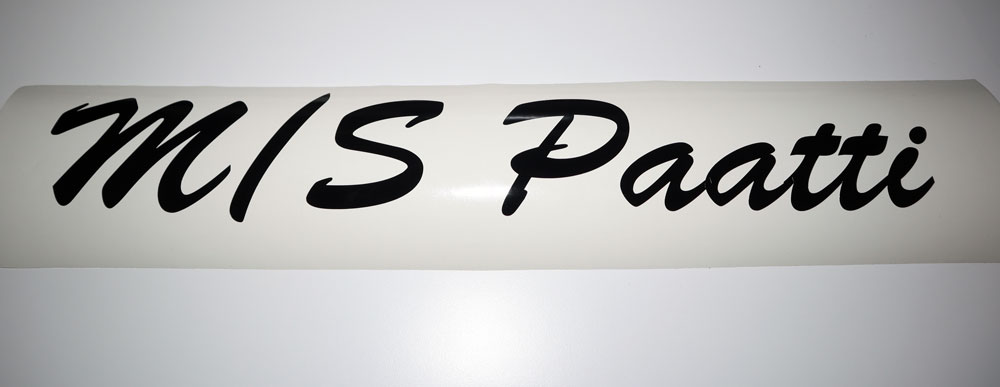 Veneen nimitarra kuvanmukaisella fontilla. Valmistetaan lähtökohtaisesti niin, että on noin 50cm mittainen. Eli mitä enemmän tekstiä, sitä matalampi tarrasta tulee. Kuvan mukainen noin 8cm kirjainkorkeudella (eli isot kirjaimet ovat tämän korkuisia), lisäkirjaimet tekisivät matalammaksi. Jos haluat pienemmän, laita lisätietoja kohtaan haluttu koko.